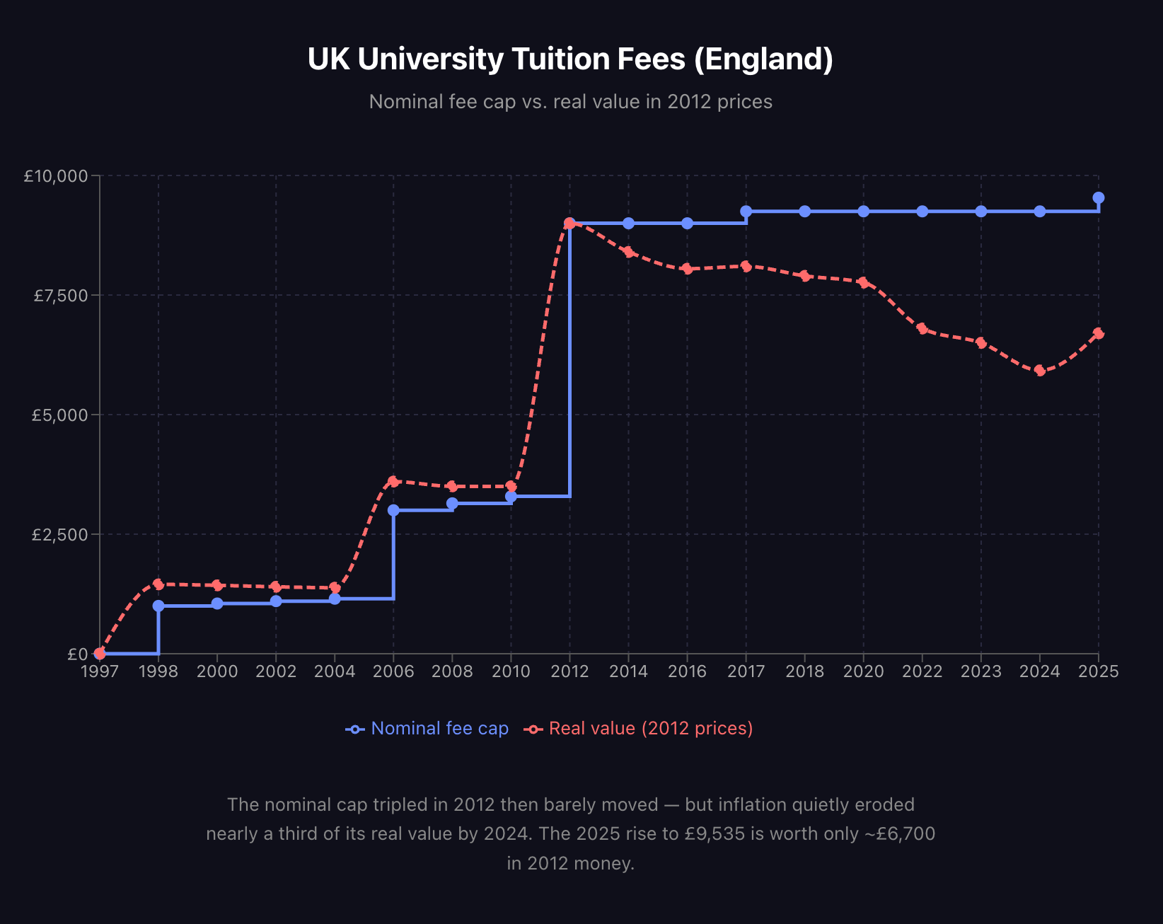 - Fees jumped up from 3k to ~9k in 2012 (the year I started uni). They stayed fairly flat since then in nominal terms which means they fell in real terms.